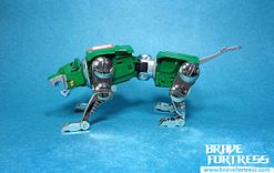 Piloted by the youngest (and resident genius) member of the team, Pidge (Hiroshi Suzuishi). The Green Lion is able to navigate easily across woodland terrain.