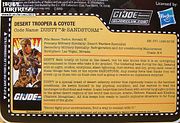 Based on his appearance in the G.i. Joe DIC cartoons, Dusty is given an all new look, complete with his own pet sidekick, a coyote. The head sculpt is a reuse of the Lt. Falcon head.