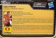 Crystal Ball never really appeared in any of the cartoons. He appeared only very briefly in the Marvel Comics run and was subsequently killed alongside Raptor, Voltar and Dr. Mindbender in a trap made by Cobra Commander, who was “cleaning house” of traitors challenging his control over the Cobra organization.