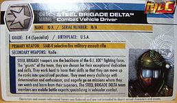 Steel Brigade Delta comes with stand, rifle, and two knives that plug into his shoulder and back sheathes.