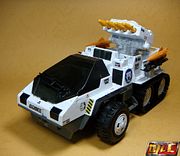 For the unfamiliar, Wolf Hound is an updated version of the vintage Snow Cat, with new missile launchers, new windshield and most obviously, a “weathering” motif. Unfortunately, the weathering is really bad in some areas (like someone smeared grease all over the white plastic). Luckily, the stickers lessens the weathering effect down a bit.