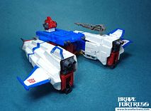 Some folks received their copies with damaged chrome on Star Saber’s chest, mainly due to the way the ties were holding him down in the box. Mine has some too, but it’s not too terrible. If you get a really bad unit, Toyhax.com has chromed stickers to fix the issue.