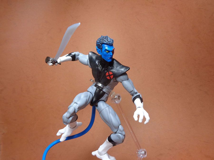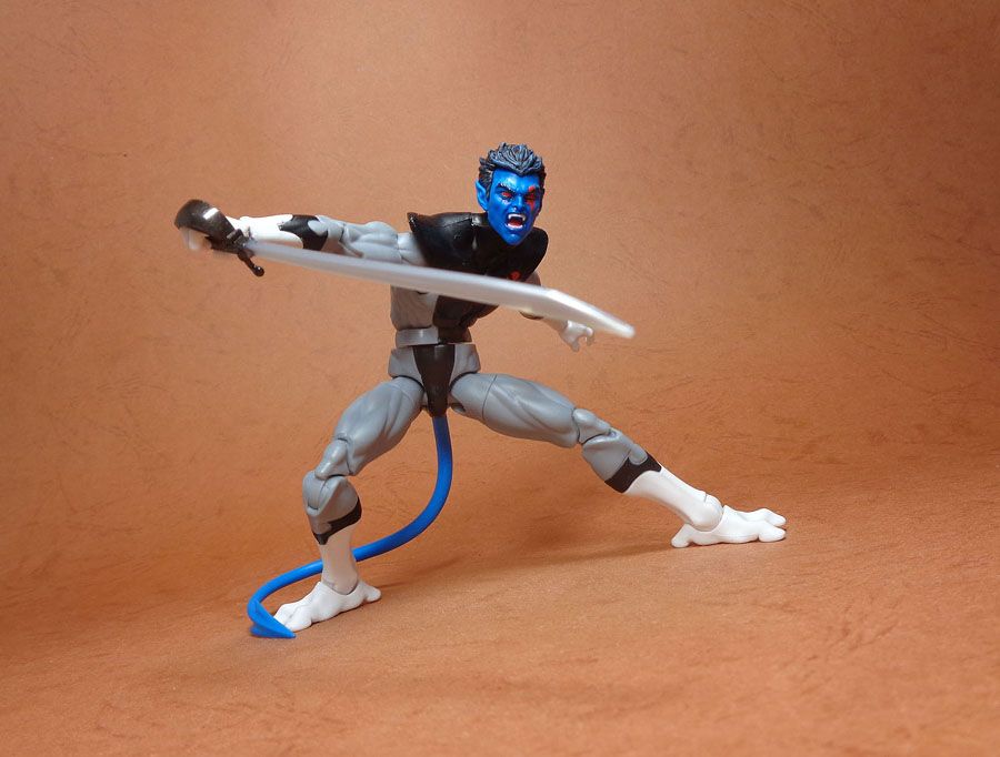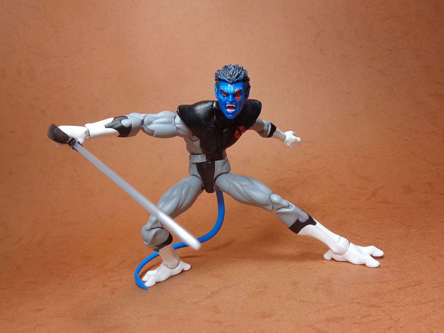The figure comes with his sword. Nightcrawler often fancies himself as a swashbuckling hero, thanks to all the adventure books he read as he was growing up. He loves to fence against his opponents when he can.