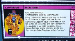 Drag Strip lives to race, and desperately wants to win, by any means necessary. Proud, obnoxious and nasty, even Megatron prefers to slag him than talk to him.
