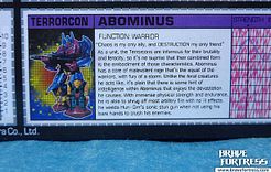 Brutal and ferocious, Abominus carries the vile traits of each Terrorcon and magnifies it. This super warrior often goes into a blind rage in battle, crushing everything in its path, leaving nothing standing in its wake. Immensely tough and powerful, this combiner can shrug off most artillery fire as if it was nothing.