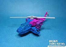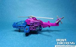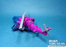Spinster comes with two weapons meant to be his Targetmasters. The NFM Dual-Fusion Cannon and the Spin-Blast Particle Beam Cannon.